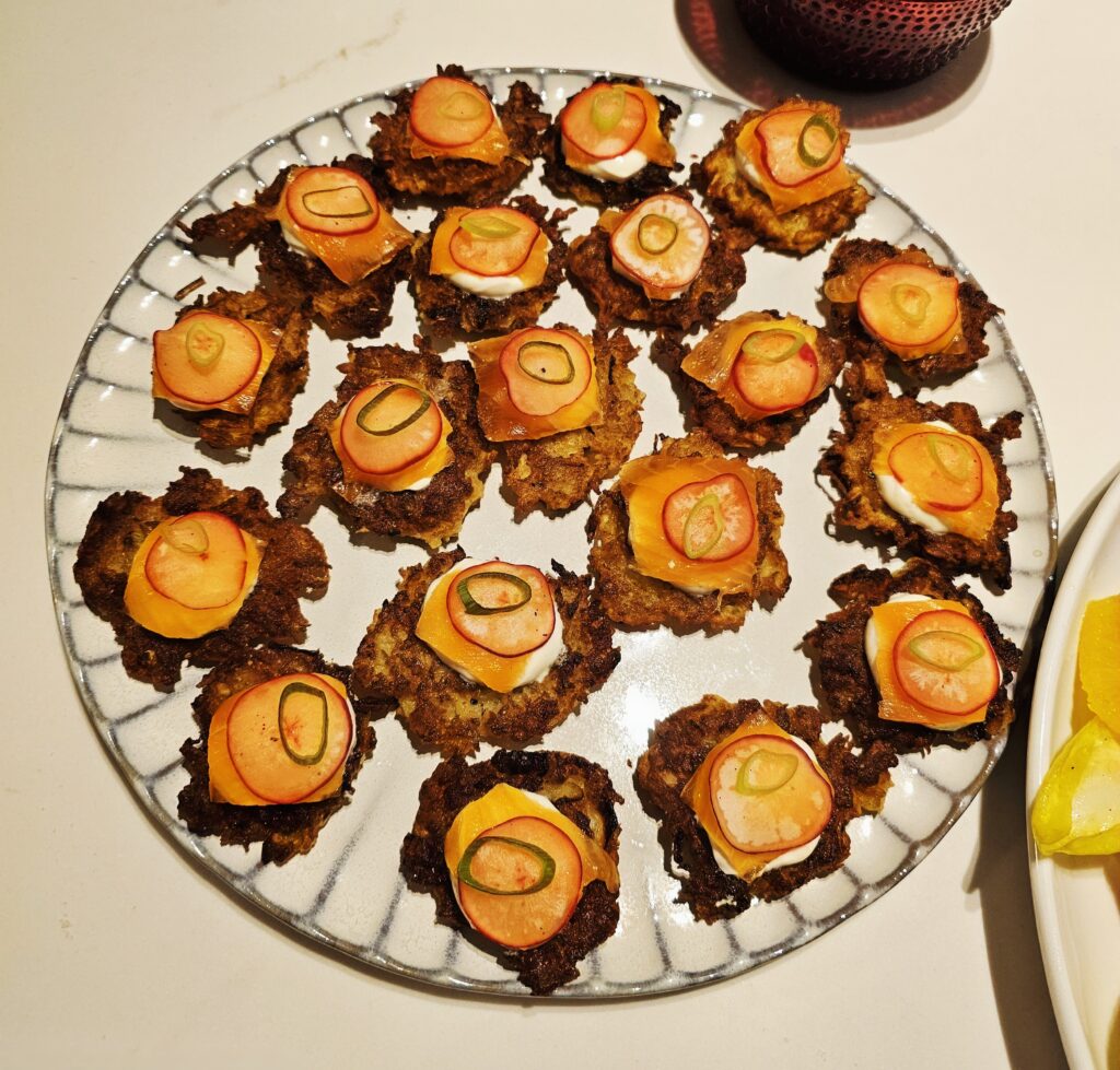 Potato latkes with sour cream, smoked salmon and pickled radish