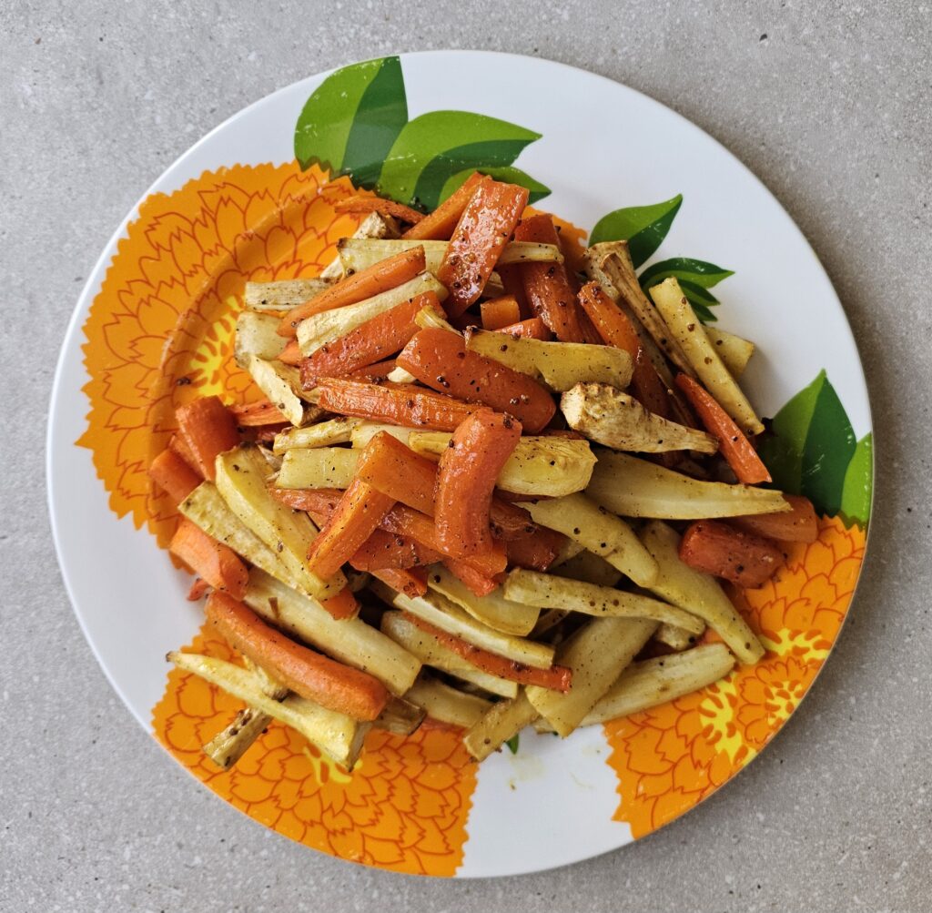 Parsnips and carrots roasted with olive oil, maple syrup and wholegrain mustard