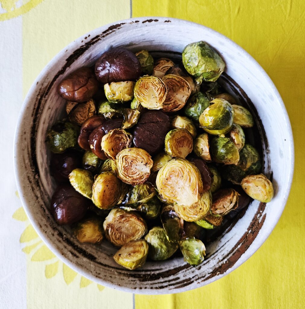 Brussels sprouts two ways: roasted with chestnuts and sliced raw with parmesan and toasted walnuts (from Josh McFadden’s Six Seasons with Vegetables, see an online recipe here)