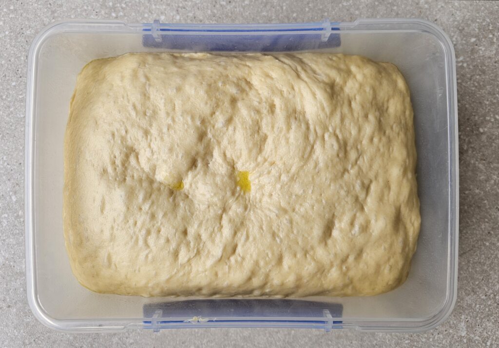 This time I used a deep rectangular tupperware for the proofing, to help with the shape later when the dough is rolled out before filling.