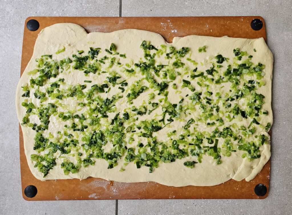 Spread the spring onion all over the dough, leaving the oil behind to brush on top later.