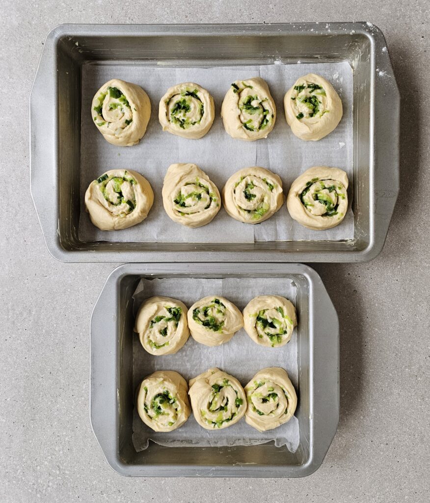 Place the rolls in a baking tin lined with non-stick baking paper. When all the rolls have been formed, cover with a piece of cling film and proof for around 45 minutes, until doubled in size.