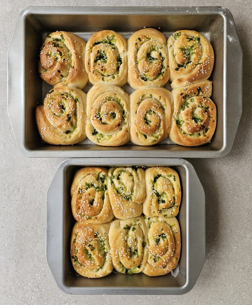 Start with one recipe for Milk Bread. Whilst this is on its first rise, finely chop 180 g spring onions using both the green and white sections. Fry this in 5 tablespoons of sunflower oil along with 1½ teaspoons of fine sea salt, for around 5 minutes over a medium heat. The spring onions should soften but not brown.