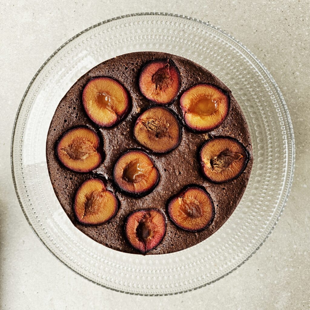 After a cheese board with sourdough crackers and home-made membrillo, we had a Chocolate and Plum Cake with rum and raisin ice cream. I used the quantities for a 7-inch Chocolate and Almond Cake but baked it in an 8-inch tin, topping it with halved plums. The baking time remained at 35 minutes.