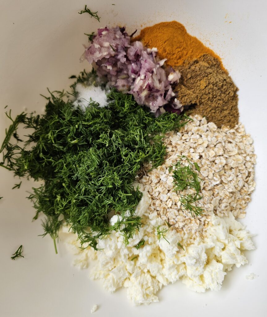 Place the minced chicken, onion, garlic, feta, oats, dill, cumin, coriander, turmeric, salt and pepper into a large mixing bowl.