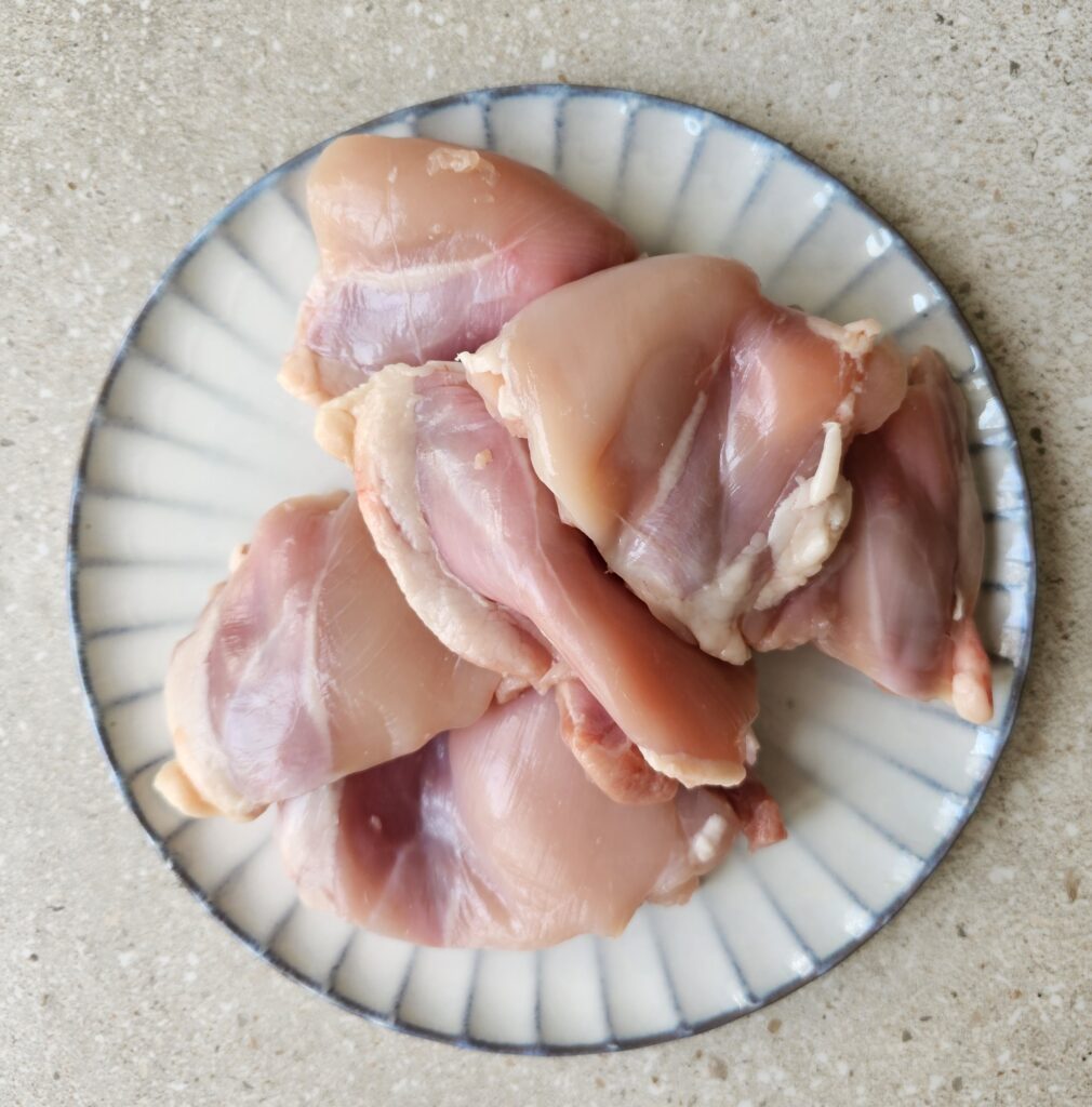 Cut each chicken thigh into 3 – 4 smaller pieces. Freeze for around half an hour as it is easier to mince partly frozen meat. Place the chicken in the bowl of a food processor and blitz for a few seconds until you get a rough paste. You will need to do this in a few rounds as there is too much chicken to process all in one go.