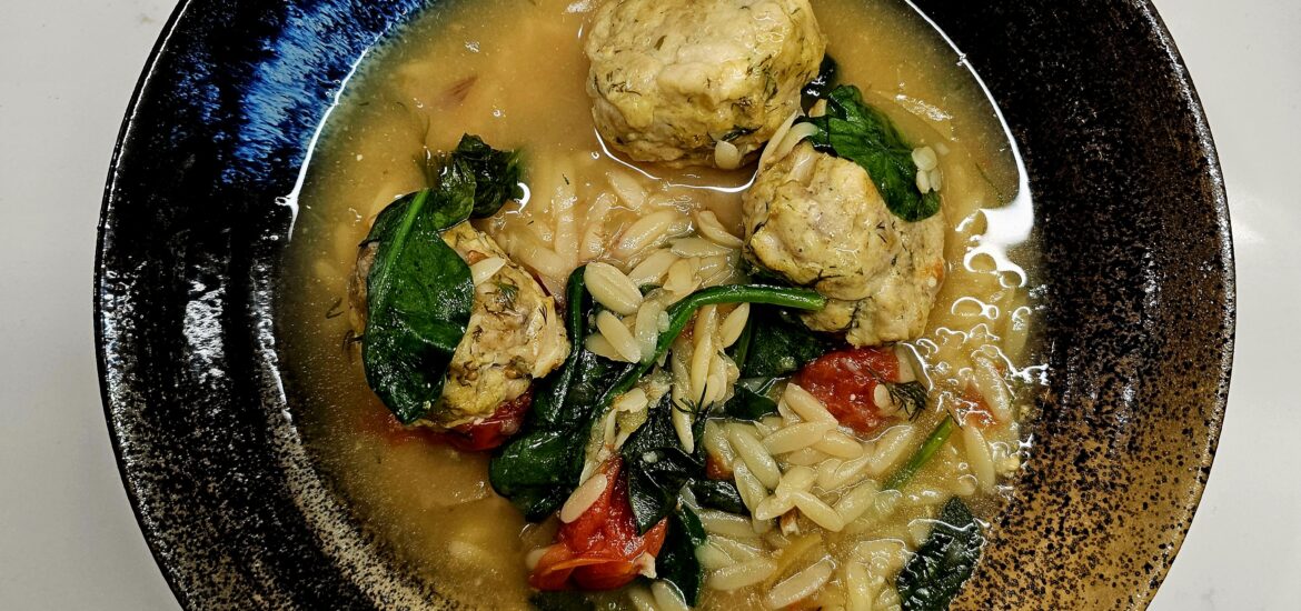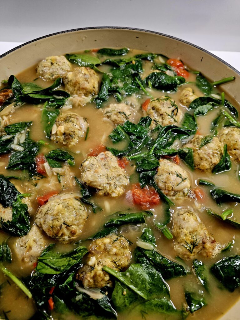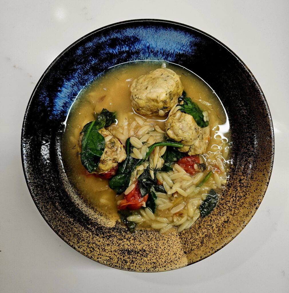 My recipe is below, using chopped chicken thighs and taking the readers’ advice to use orzo pasta instead of oats in the soup and to bake the meatballs. I made a double this recipe, so everyone had a takeaway box for next day’s lunch at work. We also had a large salad and some grilled asparagus.